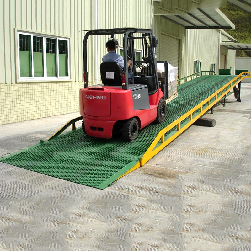 移動式液壓登車橋移:動式液壓登車橋移動式液壓登車橋移動式液壓登車橋是與叉車配合使用的貨物裝卸輔助設備,可根據汽車車廂的高低調節高度,叉車可以直接通過本設備駛入車廂內部進行貨物的批量裝卸,僅需單人作業,即可實現貨物的快速裝卸。它使企業減少大量勞力,提高工作效率,獲取更大經濟效益。
